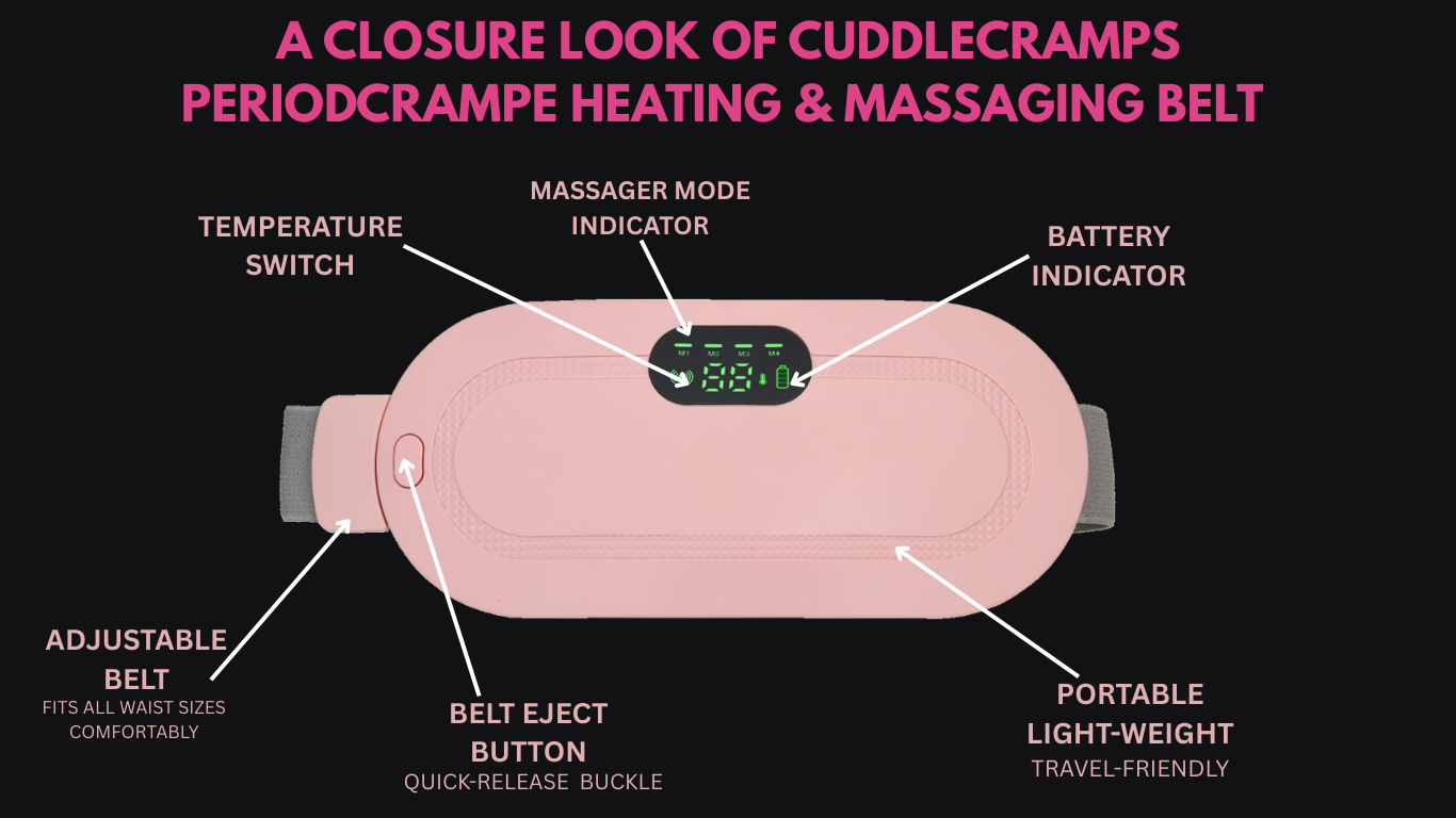 The PeriodCrampe Heating Pad is your everyday comfort solution for menstrual cramps and body aches. With adjustable straps, soothing heat, massage modes, and a soft breathable design, it keeps you relaxed at home, at work, or on the go.